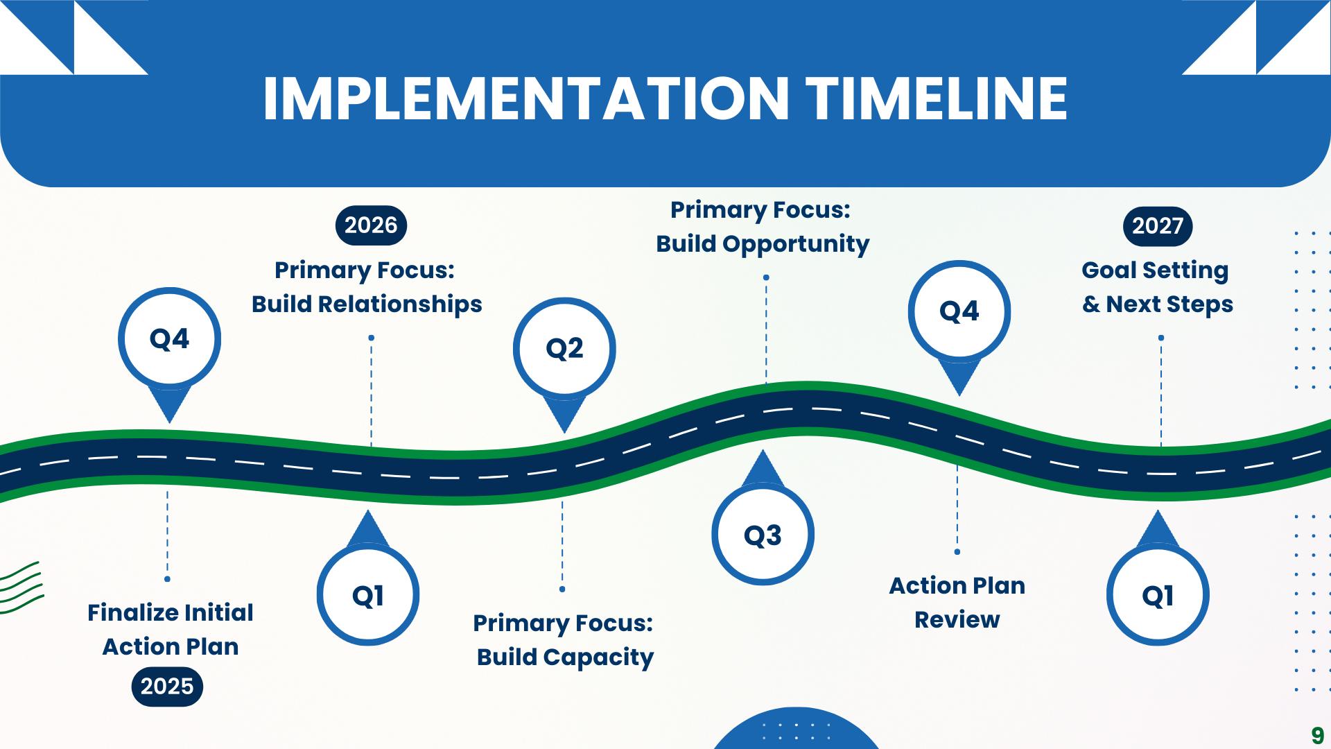 Actions to establish and strengthen relationships with key stakeholders through networking opportunities, proactive outreach, and ongoing engagement initiatives.