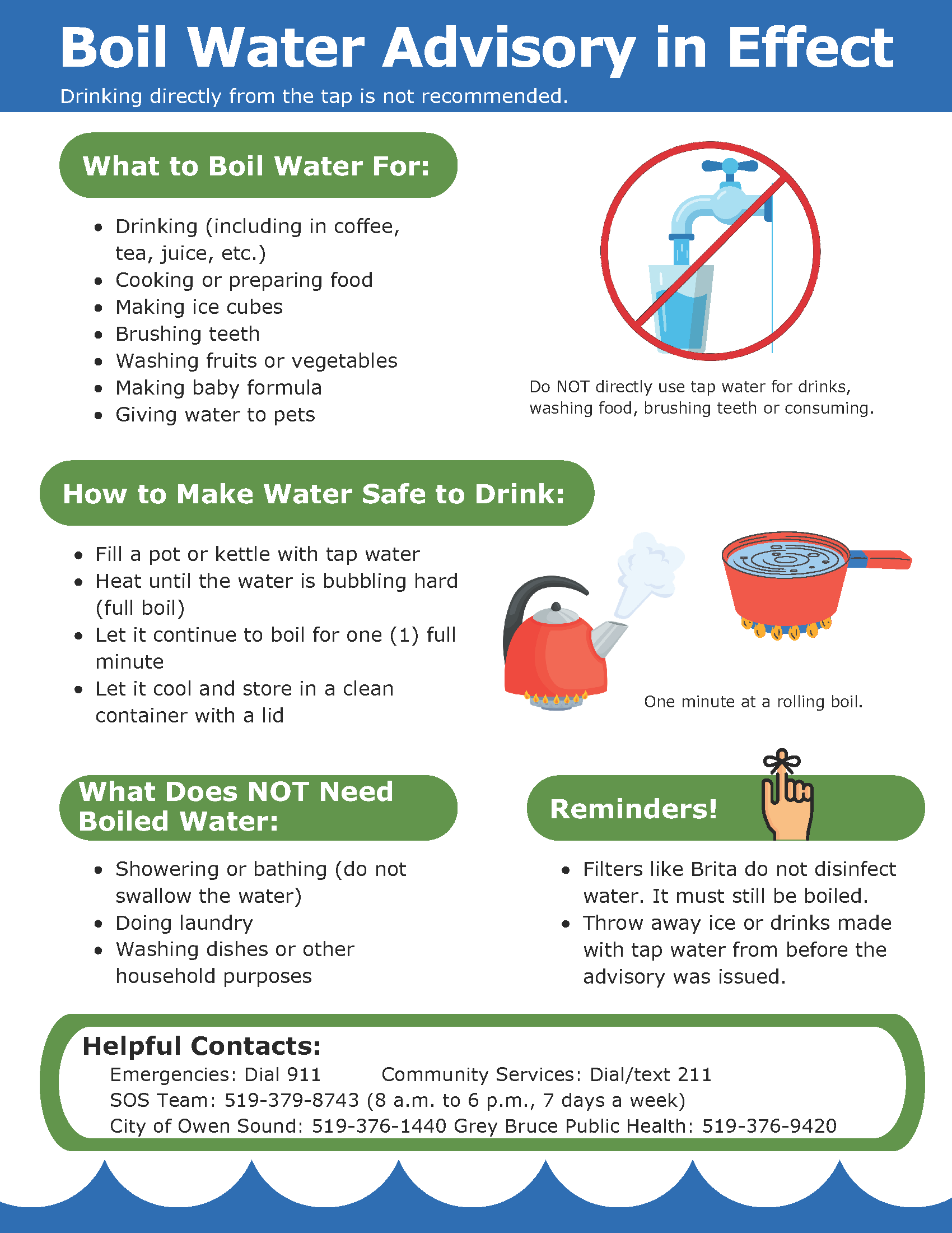 If looking for more specific information about boil water advisories, please visit Grey Bruce Public Health's website for guidelines and specific fact sheets (including those for food services, healthcare facilities and dental offices).