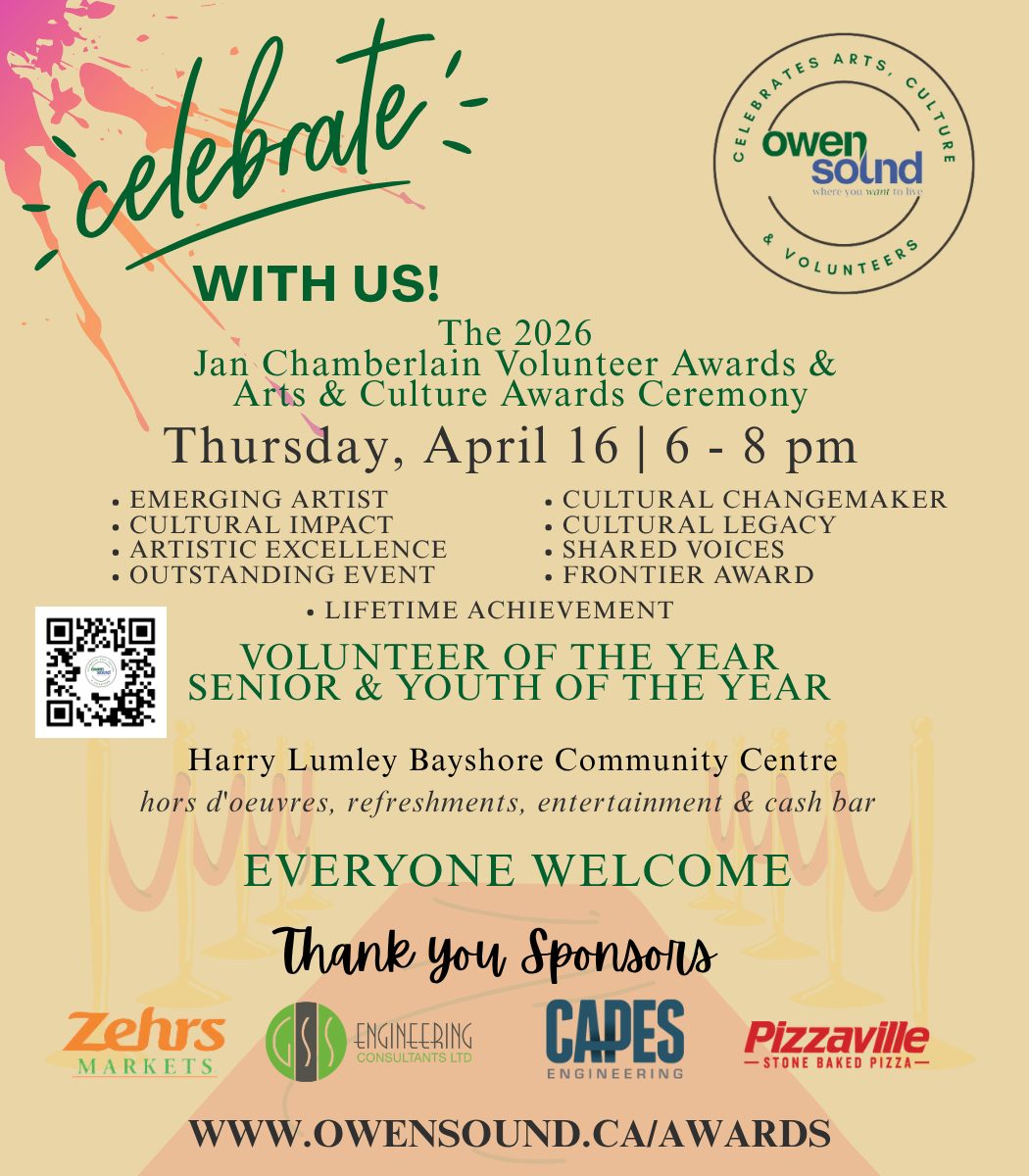 The City of Owen Sound is inviting you to the 2026 Arts, Culture and Volunteer Awards ceremony, which will take place at the Harry Lumley Bayshore Community Centre this Thursday, April 16 from 6-8 p.m. The event is free to the public, includes light snacks, entertainment, and a cash bar. The biannual Arts and Culture awards are presented in partnership this year with the annual Jan Chamberlain Volunteer of the Year awards.