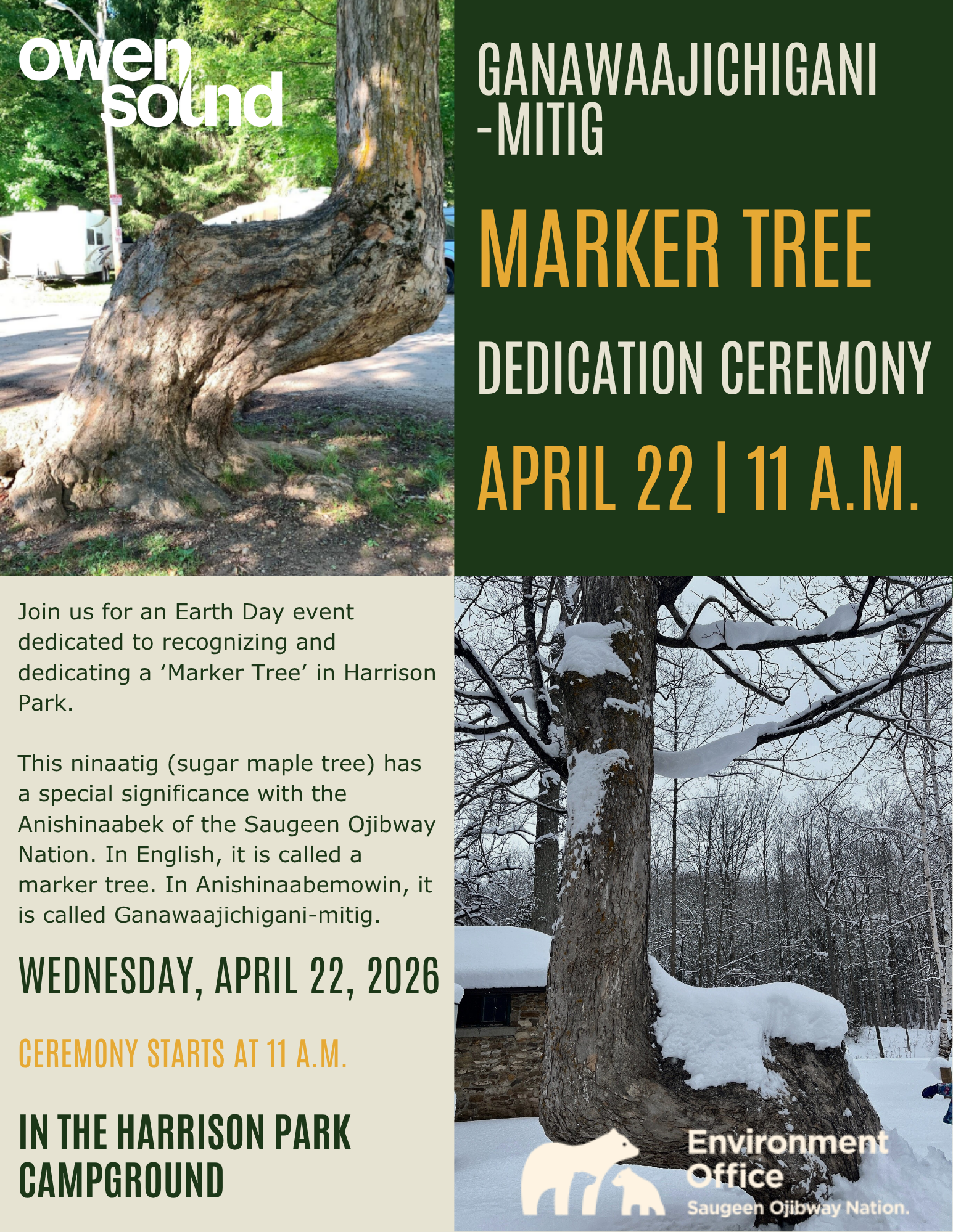 The City of Owen Sound and the Saugeen Ojibway Nation Environment Office (SON EO) invite the public to attend a Marker Tree Dedication Ceremony recognizing this culturally significant tree located beside the river in the Harrison Park campground.