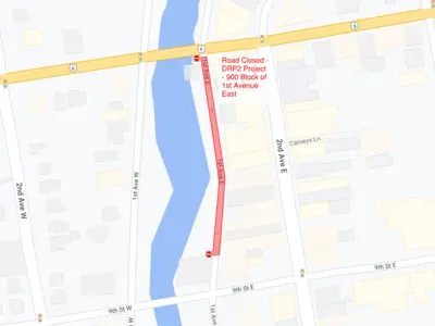 Construction on the 900 block of 1st Avenue East (from the north entrance at 10th Street East to the north side of The Sydenham Condominium building) as part of the Downtown River Precinct (DRP) Phase 2 is set to begin this week and is scheduled to end in September 2024.