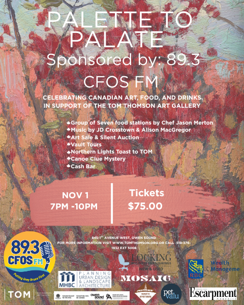- Sponsored by 89.3 CFOS FM, Palette to Palate will take place on Saturday, November 1, from 7 p.m. to 10 p.m. at the Tom Thomson Art Gallery
