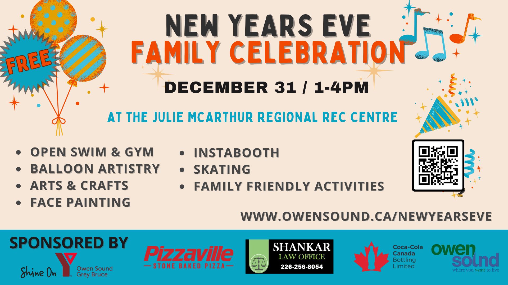 The City of Owen Sound will once again host the New Year’s Eve Family Celebration in partnership with the YMCA Bruce Grey Owen Sound at the Julie McArthur Regional Recreation Centre on Wednesday, December 31, from 1 p.m. to 4 p.m. Admission is free, but donations are greatly appreciated at the door.