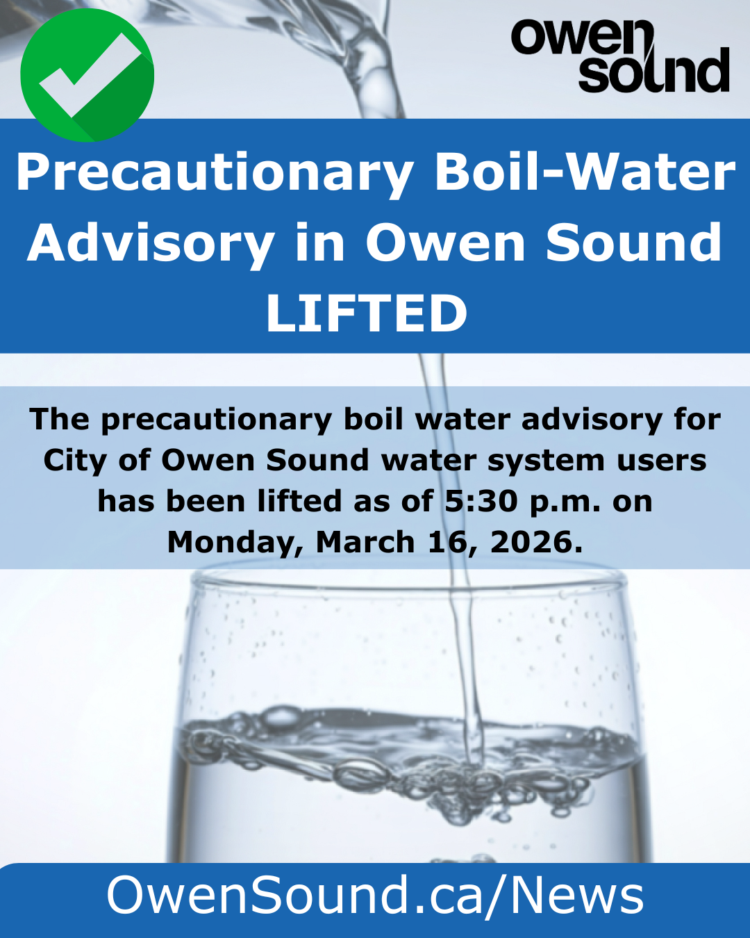 The precautionary boil water advisory for the City of Owen Sound has been lifted based on an engineering assessment, conducted by Public Health Ontario and the Ministry of the Environment, Conservation and Parks (MECP), confirming adequate disinfection of the water. This confirms the water is safe to drink.