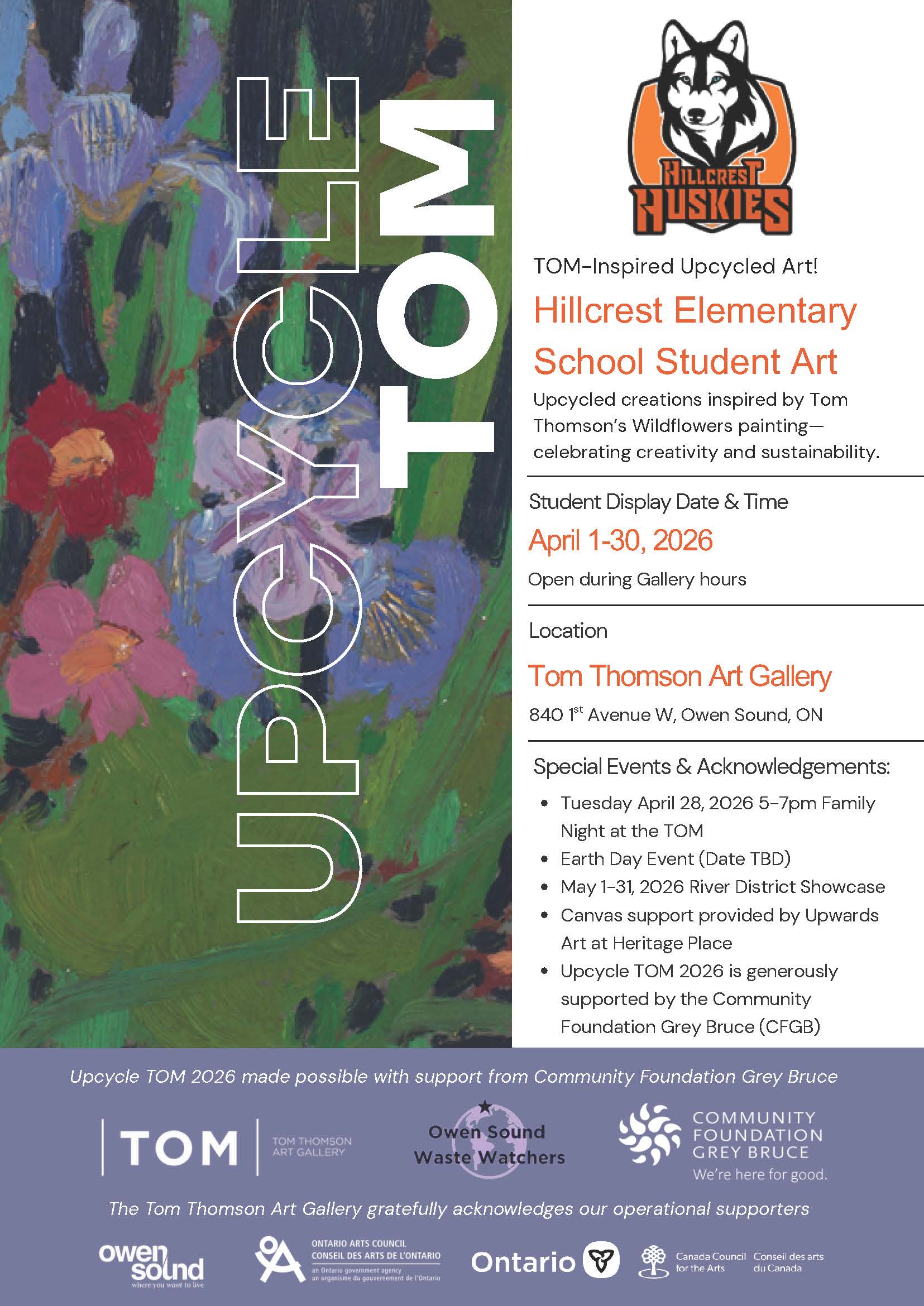 The Tom Thomson Art Gallery (The TOM), in partnership with Owen Sound Waste Watchers (OSWW), is thrilled to announce the return of Upcycle TOM 2026, with Hillcrest Elementary School leading the charge! This year, students will again explore creativity, collaboration, and sustainability by creating upcycled artworks inspired by the legendary Canadian artist Tom Thomson.