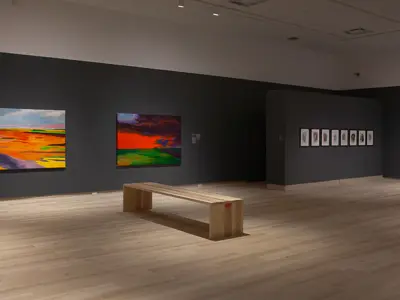 In this exhibition, Devine reflects on land and how its possession and control are at the heart of warfare through the stories of eight pivotal figures: three Victoria Cross recipients interred in Owen Sound, four Indigenous warriors who fought on various North American battlegrounds, and her father, who served with the Canadian army in Belgium and Holland in 1944. The exhibition includes delicate charcoal portraits of these individuals, coupled with expansive landscape paintings inspired by their actions, and smaller monoprint studies of each battle site.